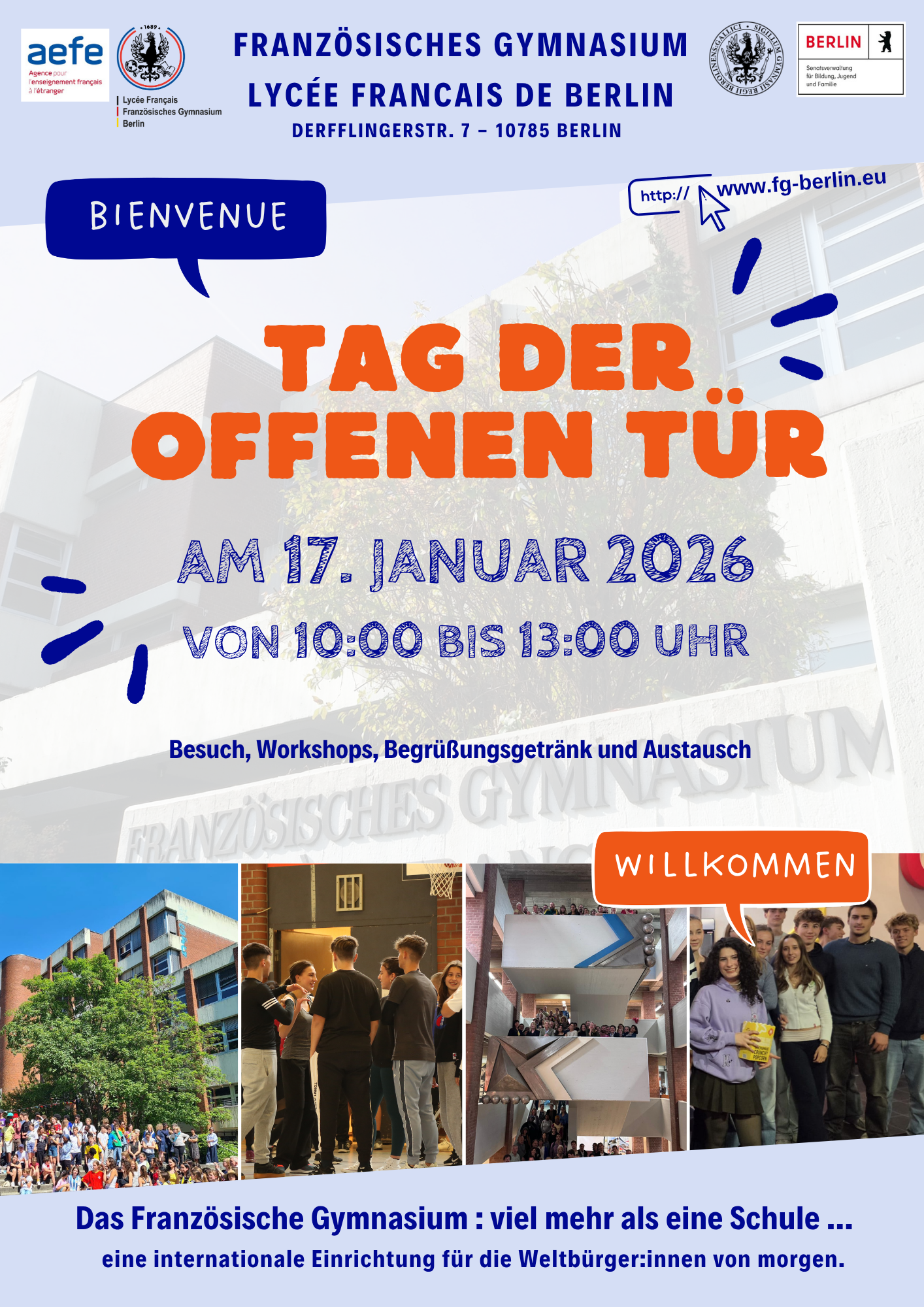 Mittwoch, 2. Juli 2025Wir freuen uns, Sie im ältesten Gymnasium Berlins und dem weltweit ältesten französischen Gymnasium im Netzwerk der AEFE (Agence pour l’Enseignement Français à l’Etranger) begrüßen zu dürfen.