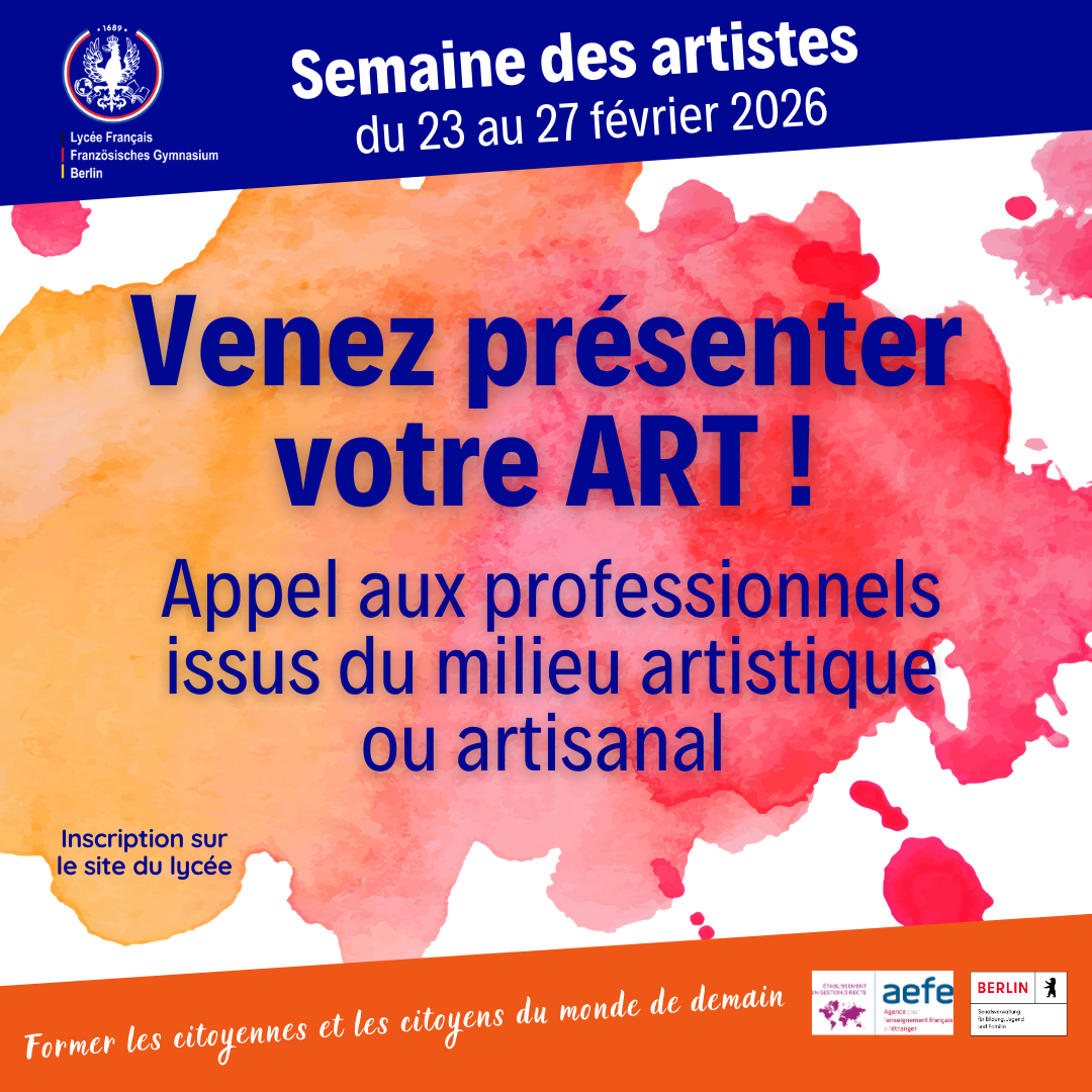 Mittwoch, 28. Januar 2026Kommen Sie zum Tag der offenen Tür des Lycée Français de Berlin und entdecken Sie unser Bildungsangebot! Treffen Sie uns am 17. Januar, um unsere Teams kennenzulernen, unsere Räumlichkeiten zu (…)