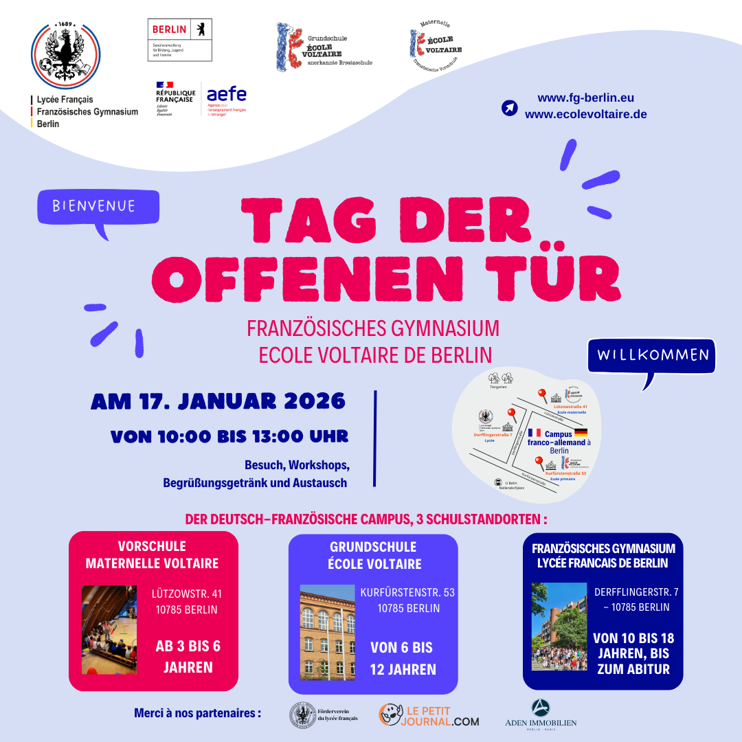 Mittwoch, 28. Januar 2026Kommen Sie zum Tag der offenen Tür des Lycée Français de Berlin und entdecken Sie unser Bildungsangebot! Treffen Sie uns am 17. Januar, um unsere Teams kennenzulernen, unsere Räumlichkeiten zu (…)