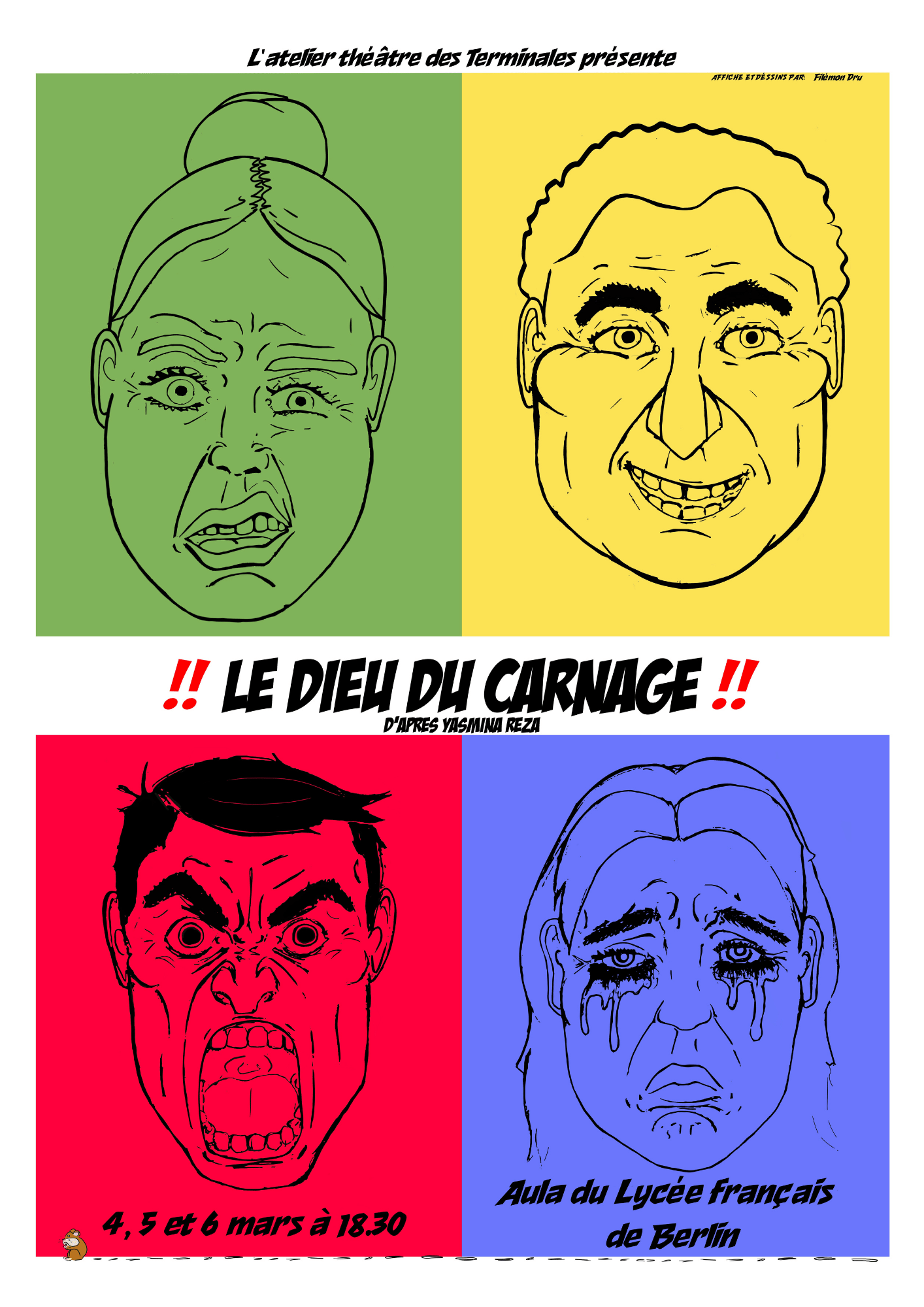 Nous vous invitons dans un huis clos qui confronte deux couples qui souhaitent régler une bagarre entre leurs enfants à l‘amiable. Très vite le vernis des formules de politesses et des bonnes conventions commence à craquer et les quatre personnages s‘entrainent dans une dispute féroce. Ni l‘aimable Annette ni le Michel jovial et hospitalier ni Alain qui se croît détaché de tout ni Véronique soucieuse des valeurs ethiques échappent au Dieu du carnage qui somnole dans nos entrailles.